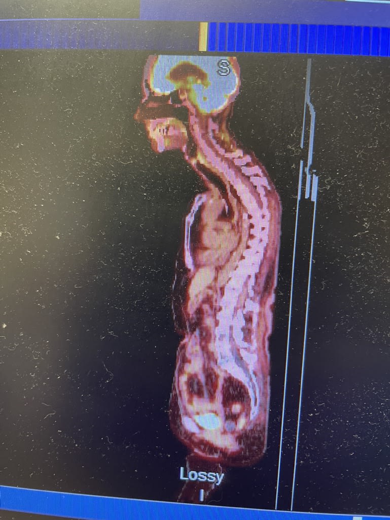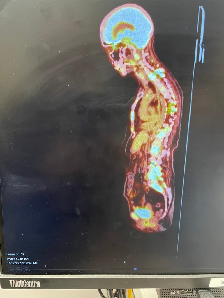 This is a PET scan. Ignoring the bluish brain and bladder, every bright spot is an active tumor. This image was take in November 2022.