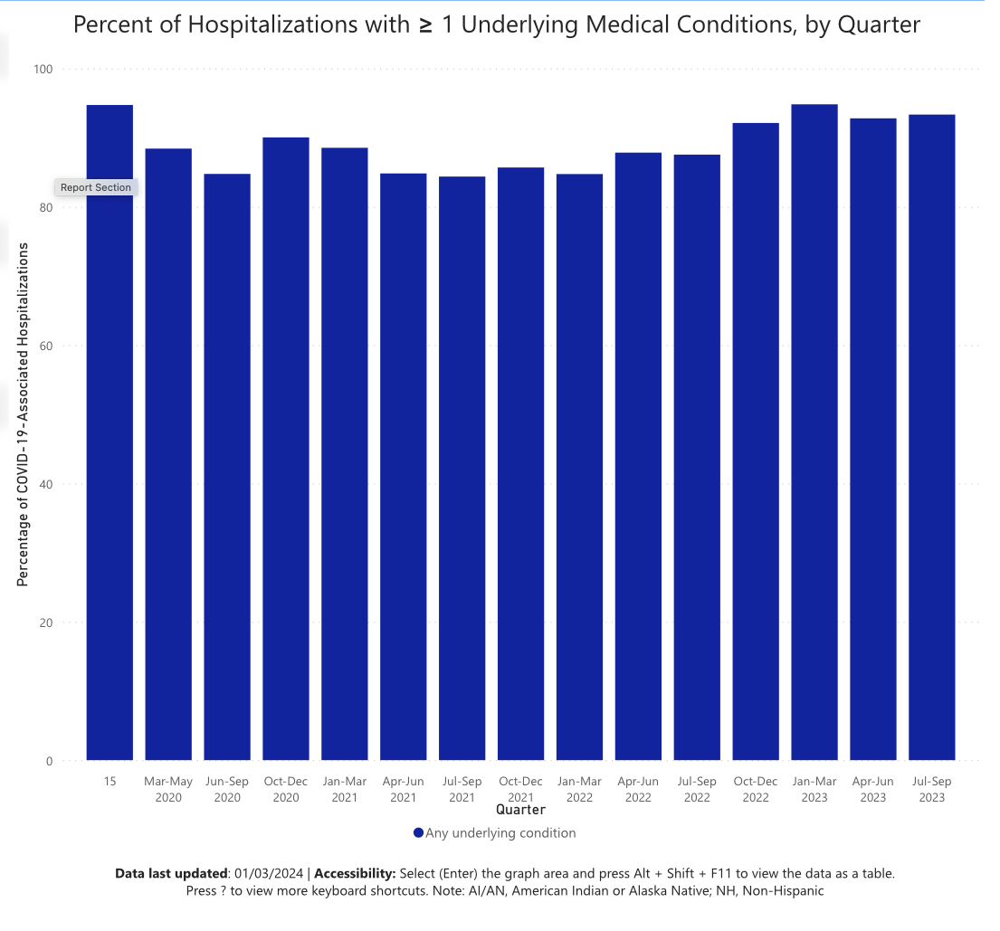 And here is the graph that tells gives you the old bottom line which is this: Since 2020 greater than 80% of all COVID-19 Hospitalization occurred among people who had at least 1 co-morbidity, that is an “Underlying Medical Condition”.
