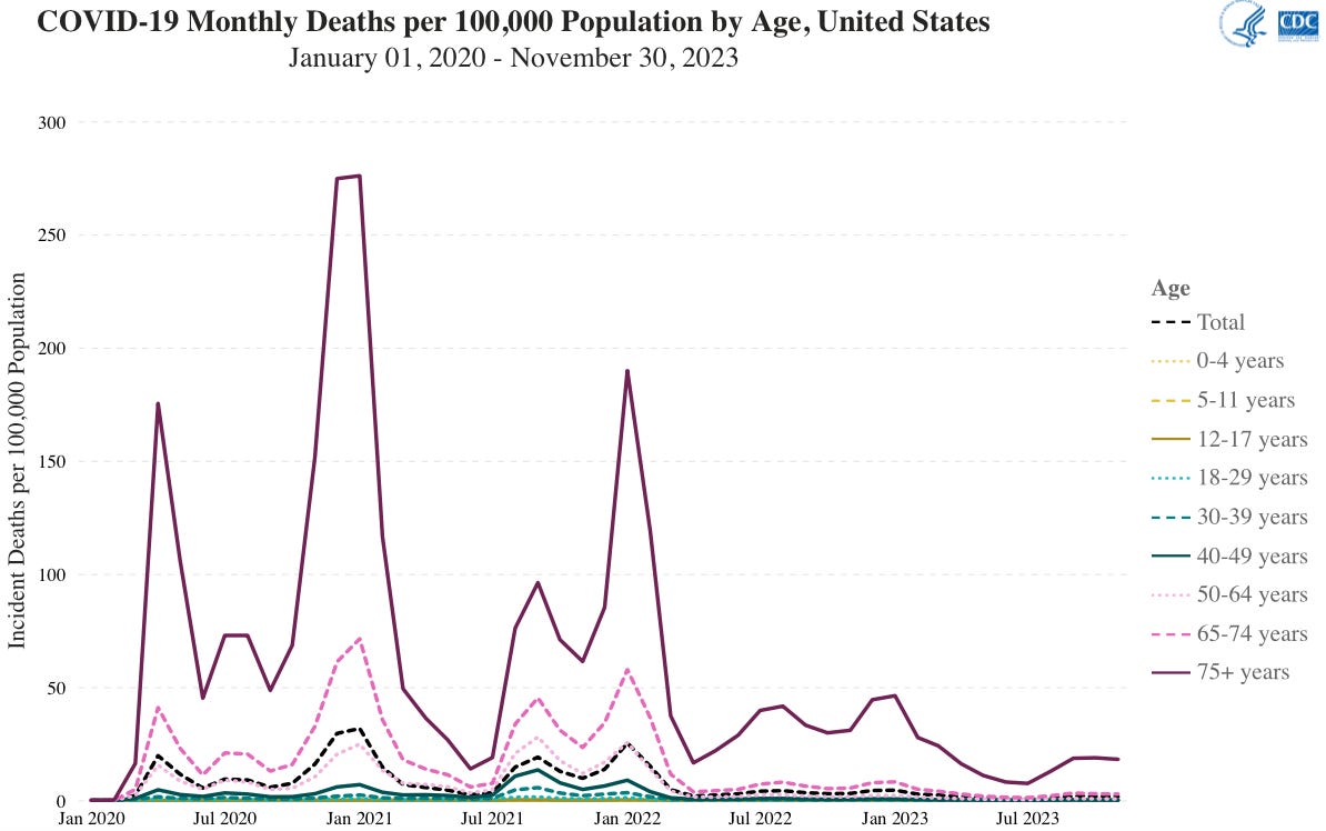This picture of monthly deaths is a bit more informative because it reports which age groups are most affected by COVID-19 and it would be much prettier IF we were able to see all the colors squished down along the X-axis but we can’t. The reason we can’t see all those individual colors is because it means that virtually no one has died “from” COVID-19 who was under the age of 64. In fact, the vast majority of deaths have occurred among those OVER the age of 75 which is represented by the only line that is consistently visible and distinguishable from all the others.